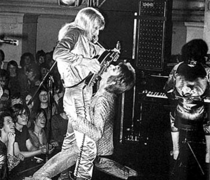 There’s no video footage of Mr. Bowie and Mick actually doing the guitar fellacio routine. The closest thing is the following clip from a show in show in Dunstable, circa 1972. Check it out!