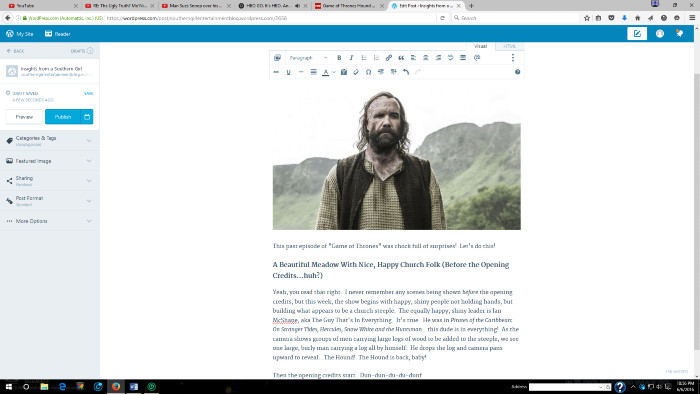 I realized in mid 2009 that I was meant to be a writer, but by the time 2016 rolled around, my career still wasn’t where I wanted it to be. One morning in April, I was lying in bed, and the idea hit me…what about an entertainment blog? Back in those days, I’d spend hours giving my opinions on movies and TV shows on the now-defunct IMDB.com message boards, and I’d always write my ass off about my favorite celebrities and other topics on various websites. With an entertainment blog, I could do the same thing I always did, and elevate my writing career at the same time! The next day, I visited WordPress.com and signed up for the cheapest website package they had—I upgraded later—and despite being sick with a stomach bug, I sat down and wrote my very first blog post, “Empire Ainβt What It Used toΒ Be.” I wish I could show you guys what my blog looked like in its early stages, but all I have is a random screenshot of me editing a Game of Thrones review/recap (I had a few editing screenshots taken back in those days, thanks to my fat fingers moving too quickly across the keys). In all honesty, the blog had a blue and white theme during its early years, so it didn’t look too much different than the editing page.