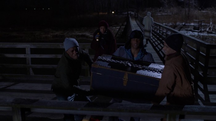 After hearing the truth, Papi and Ricky agree to help, and they hilariously find a way to get the trunk back to Blanca’s house. Once they arrive at the apartment and try to get the trunk in Damon’s old room, they break the top of it, causing the horrid smell to come out even more.